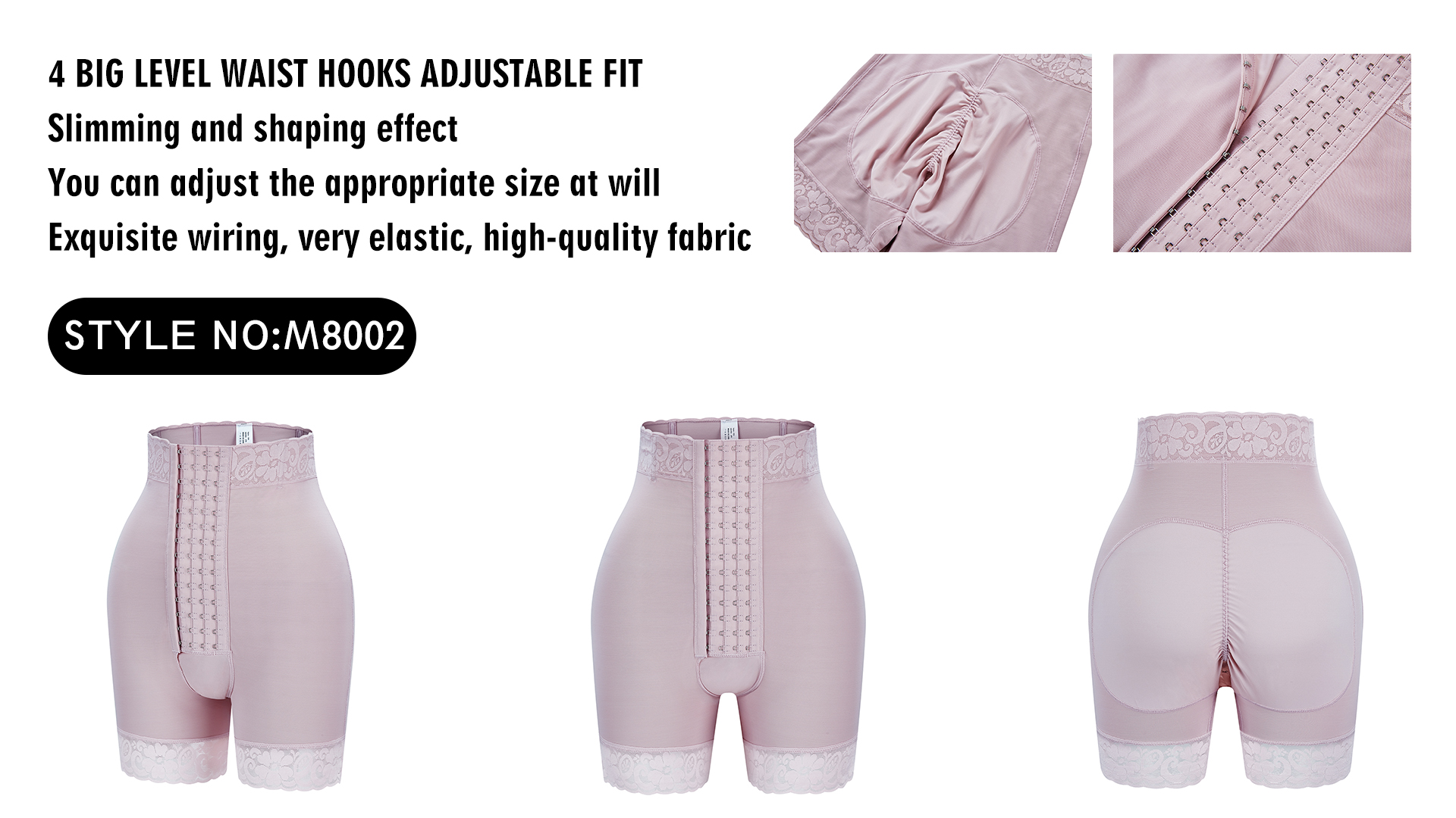 더 높은 복부 압박을 제공하고 더 큰 편안함을 위해 다양한 조임 요구 사항에 맞게 조정되는 4열 후크 앤 아이 셰이퍼 쇼츠.