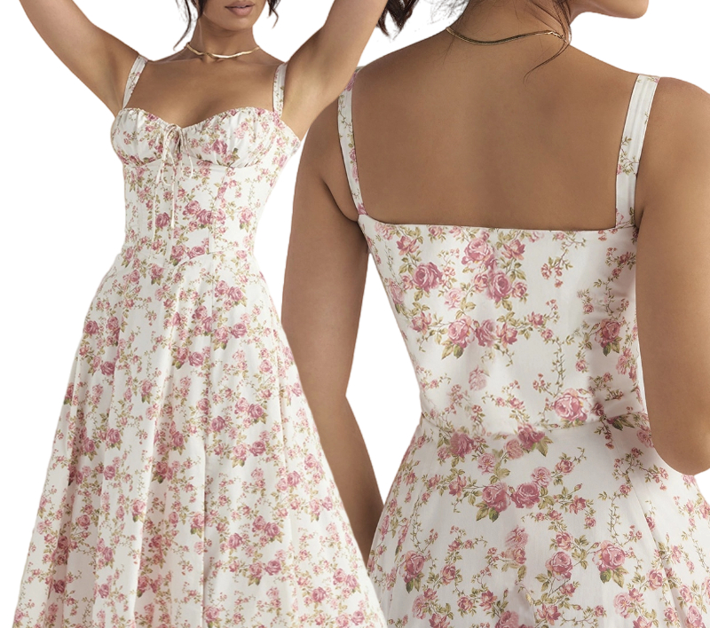 Sleeveless, floral print, flowy hem, midi length, maxi sundress, gorgeous corset dress for women sexy.