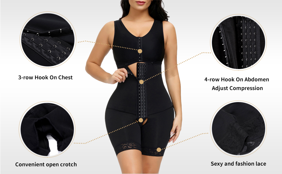 This slimming full body shaper has 4 rows hook-eye for you to adjust the belly compression you need, control on tummy area to shape the hourglass figure.