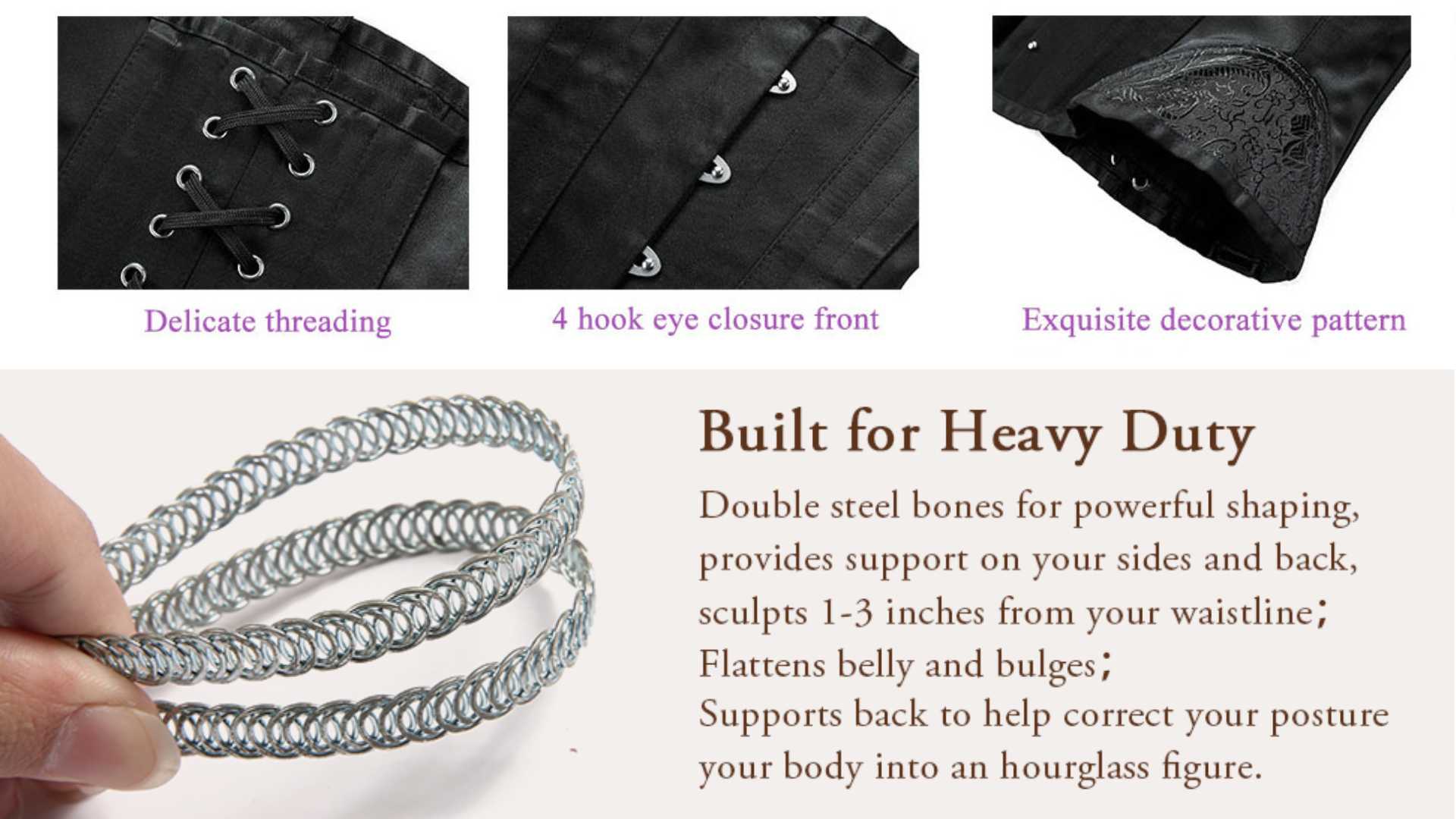 ►Heavy Duty & Double Steel Bones: 14Double Steel Bones Corsets great for waist training, 6 Strong Steel Busk Bones (1 inch wide each) at the front, Back 8 Rigid Steel Plates and 2 Spiral/Flexible Steel Bones around the corsets.This Waist corsets can draw in your waist and flatten your tummy & suitable for Tight-Lacing, Shaping and Waist Training. This corset also provide solid support to your lumbar, middle and lower back. It can also help with posture correction if wearing it during work.