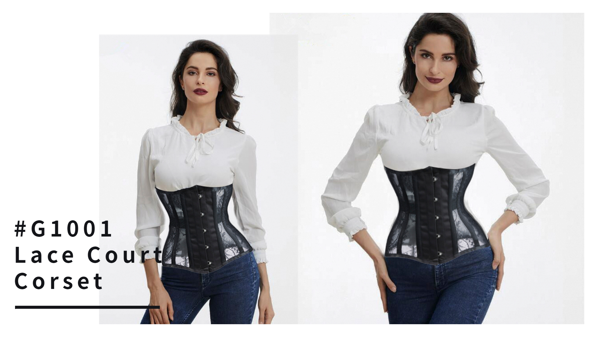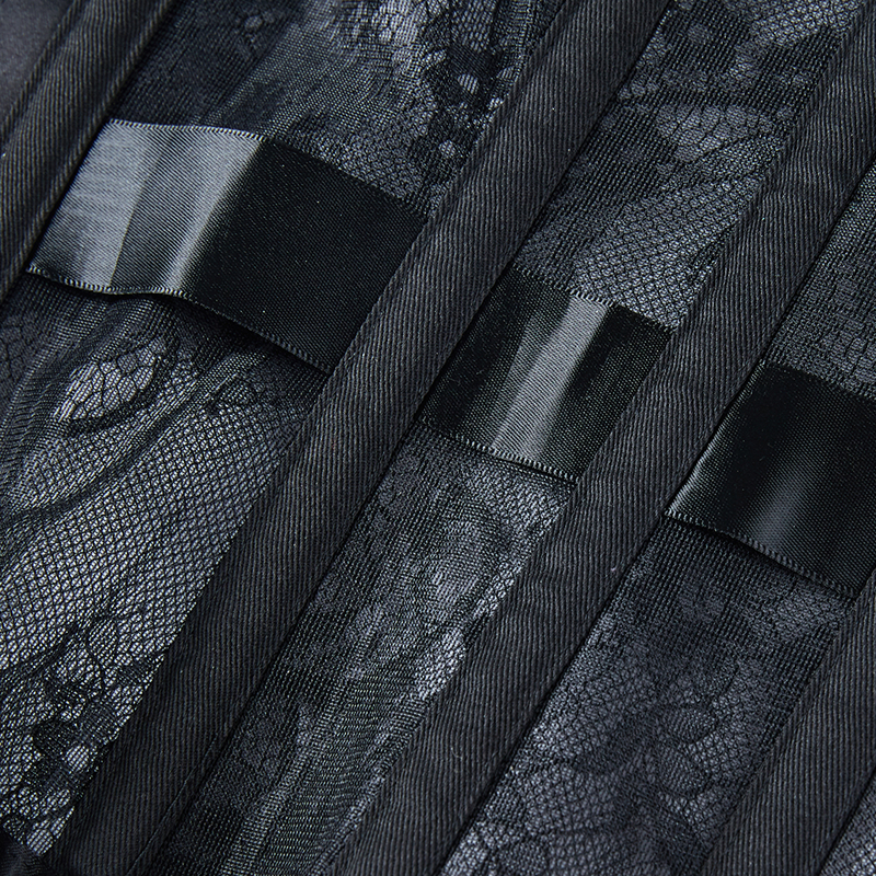 14 steel bonesstrong corset cord lacing back:ribbon lacing come with wide modesty panel,protect your skin form lacing up5 buttons, perfect waist curve.Material: Nylon, translucent lace cutout design, classic and elegant style.